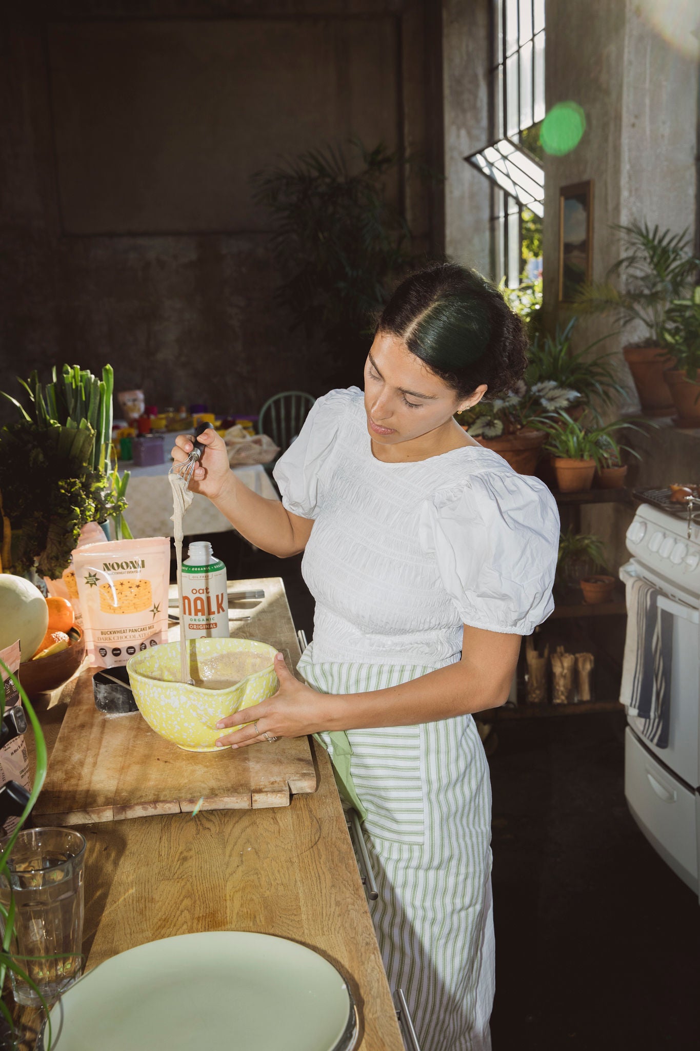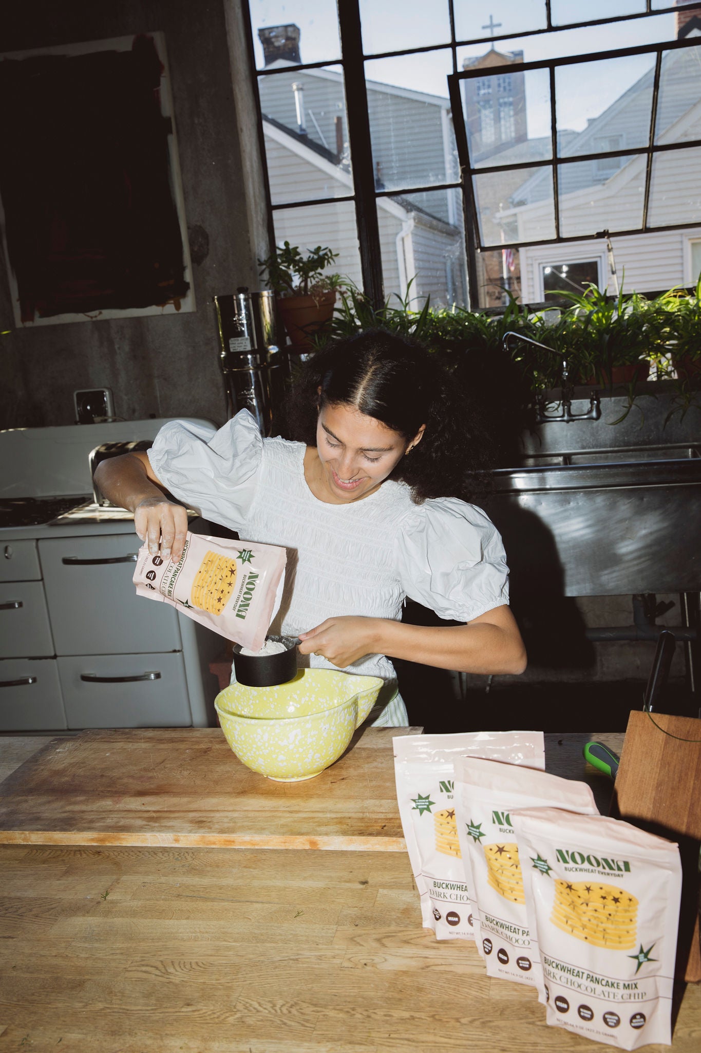 ✸ In a large bowl, add approximately 2/3 cup of Noona's pancake mix ✸ Be sure to measure the mix loosely, not packed or dense, for the best consistency.
